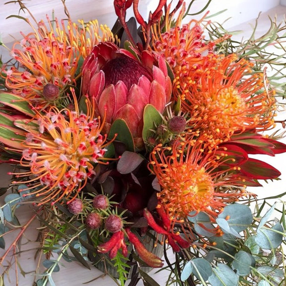 Bouquet autunnale con nutans, protee, leucadendron e verdi decorativi