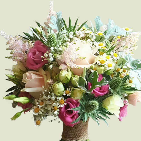 Sorprendente bouquet delicato, compatto ma dall'aspetto campestre, legato con del materiale naturale e presentato senza incarto... affascinante nel suo genere