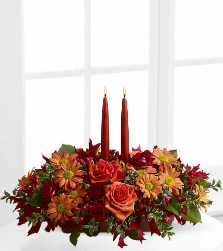 Centrotavola autunnale con candele, un'elegante fusione di colori autunnali e atmosfera accogliente.