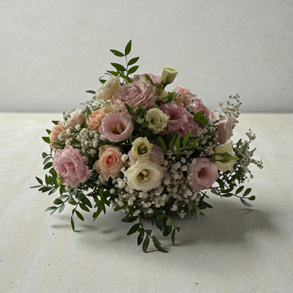 Centrotavola rotondo realizzato con gipsophila, lisianthus e rose del diametro di circa 30 cm