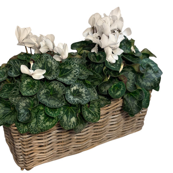 Composizione di ciclamini bianchi XL con cesto in rattan resistente all’esterno.