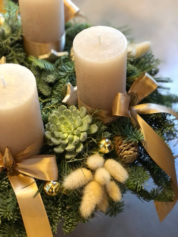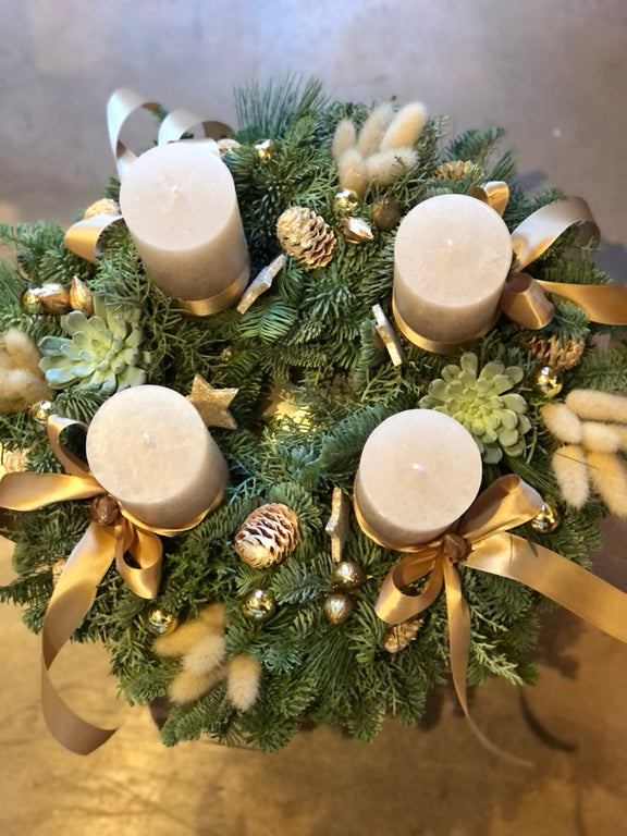 Composta da rami di abete fresco e adornata con eleganti dettagli natalizi, questa creazione artigianale aggiunge un tocco di magia alla tua casa, diffondendo un'atmosfera accogliente e festosa.