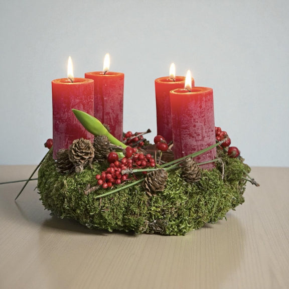 Profumata corona di muschio con amarillis.Tutto perfetto per portare ogni fortuna nel periodo più emozionante dell’anno.